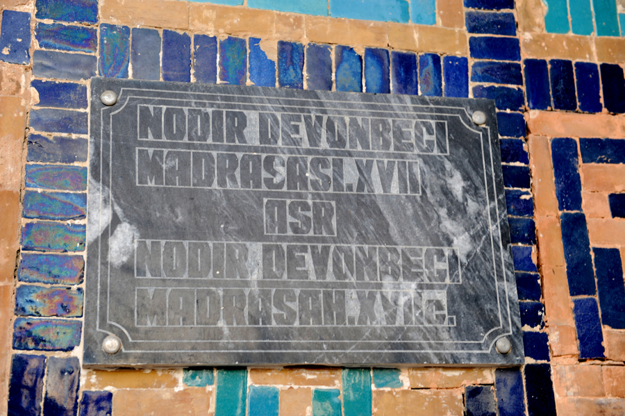 Медресе построено рядом с могилой и мечетью Хожа Ахрара. В этом медресе всё традиционно, все следует канонам ХVII столетия. Обращает на себя внимание мозаичный михраб и панель из зелёных шашек с бордюром «ислими». На портале изображены тигроподобные львы по аналогии с медресе Шердор на Регистане. Поэтому в народе это здание называют также «Шердори берун» т.е. «внеш ний Шердор». Эпиграфика медресе содержит имя заказчика «Надирбек Тагай» и дату постройки (1638 г). В стихотворной надписи над входом, указано имя ещё одного мастера Ходжа Хашима.