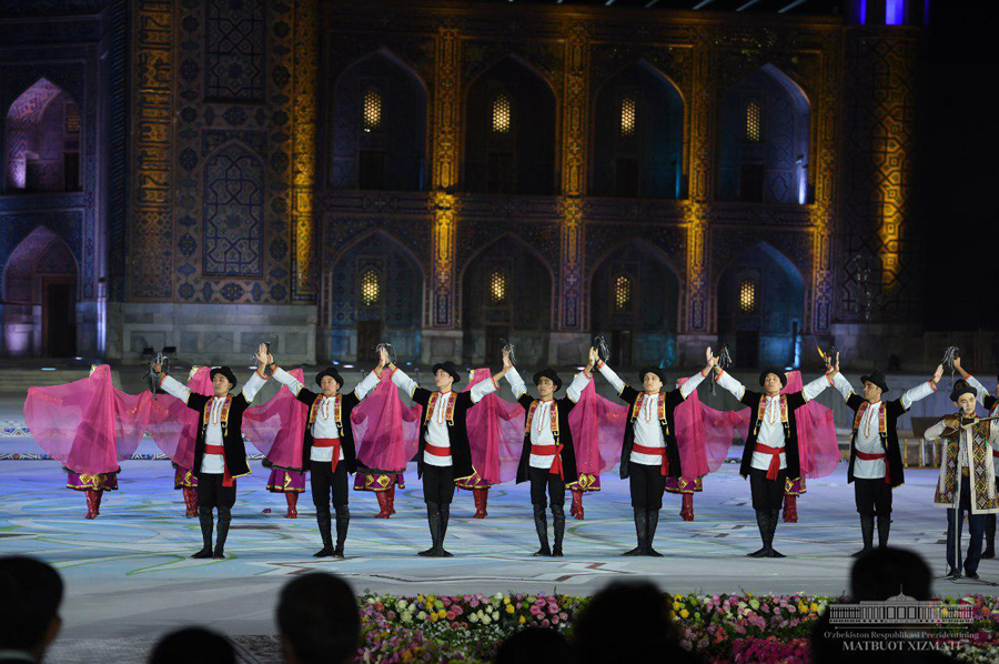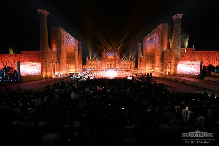 Глава государства поприветствовал гостей и поздравил собравшихся с открытием фестиваля. Шавкат Мирзиёев отметил, что мероприятие стало своеобразной площадкой для диалога между различными культурами и цивилизациями, странами и народами, и что каждый артист, поднимаясь на эту прекрасную сцену на величественной площади Регистан, воспевает высокие идеалы гуманизма, которые объединяют людей независимо от их национальности, языка и религии.