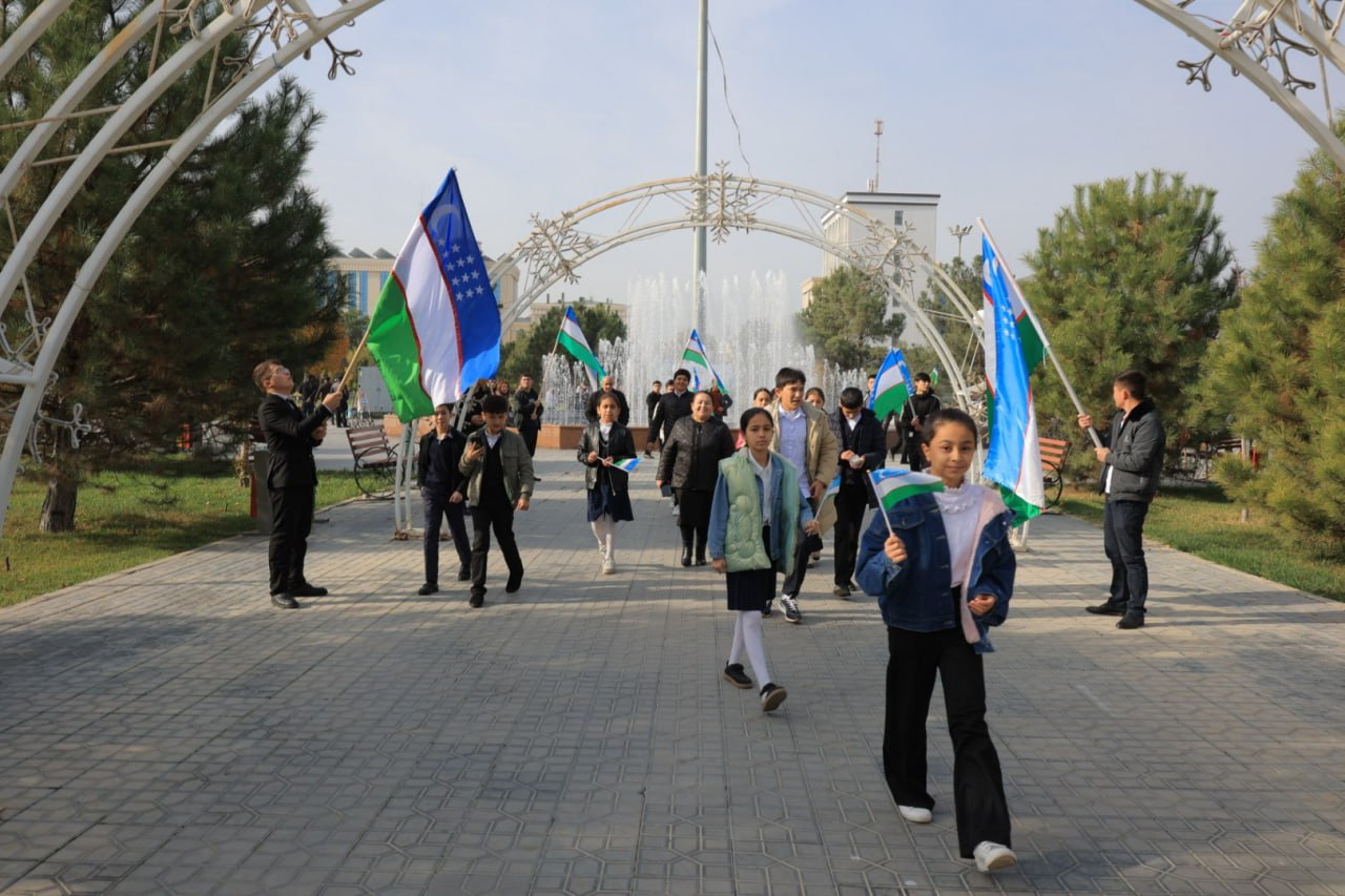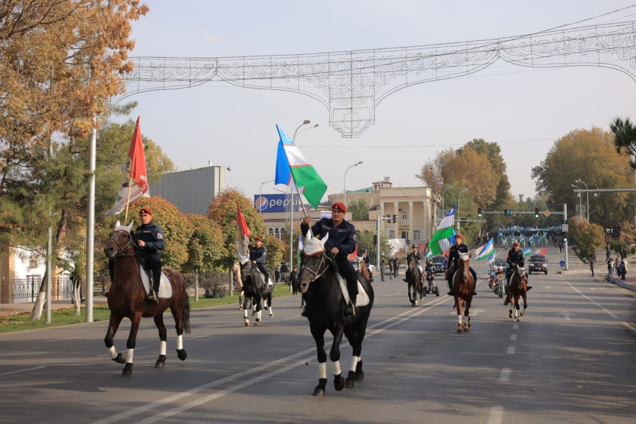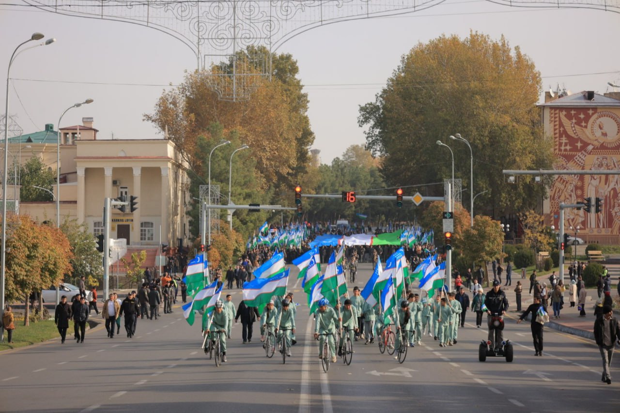 Askarlar, yosh sportchilar, kavaleristlar, ichki ishlar boshqarmasi va Milliy gvardiya xodimlari 20x40 metr o'lchamdagi bayroq bilan Kuksaroy maydoniga qarab harakat qilishdi.